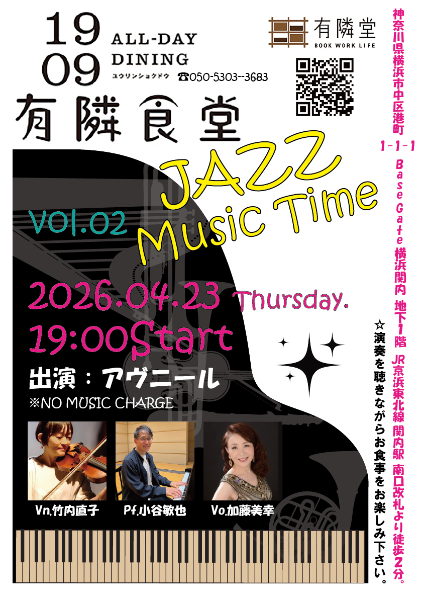 有隣食堂ライブ2026年4月23日(木)19時~ 更新日: 2026/04/09 category: TOP > イベント・ライブ情報 > 有隣食堂ライブ2026年4月23日(木)19時~ イベント・ライブ情報 一覧へ お気軽にお問合せ下さい 無料体験レッスン・見学・ご質問等 045-242-6324 受付時間 10:00~21:00 定休日 なし 無料体験・お問合せ 練習可能な時間 10:00~20:50 レッスン可能な時間 10:00~21:50 住所:横浜市中区花咲町2-62-8 ジャムビル