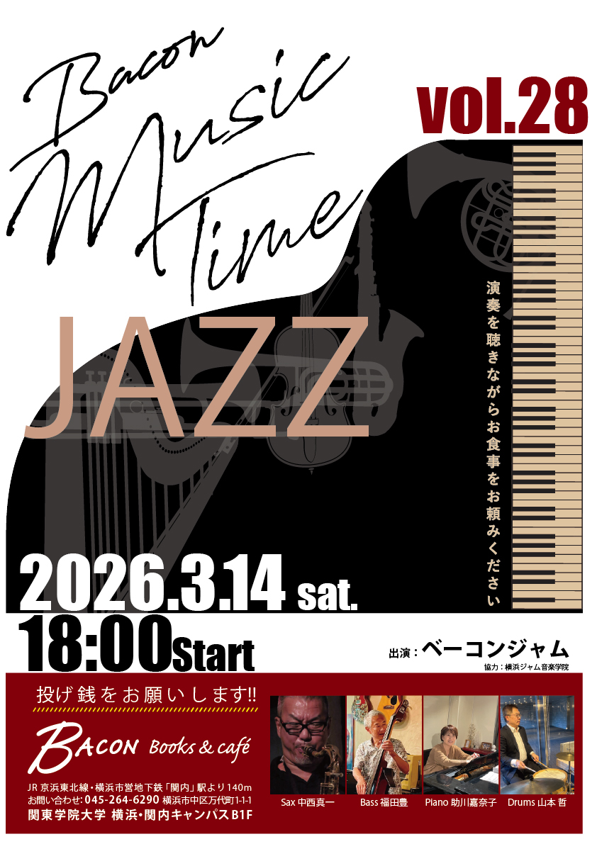 Bacon Books & cafe ライブ3月14日(土)18時 更新日: 2026/03/07 category: TOP > イベント・ライブ情報 > Bacon Books & cafe ライブ 3月14日(土)18時 イベント・ライブ情報 一覧へ お気軽にお問合せ下さい 無料体験レッスン・見学・ご質問等 045-242-6324 受付時間 10:00~21:00 定休日 なし 無料体験・お問合せ 練習可能な時間 10:00~20:50 レッスン可能な時間 10:00~21:50 住所:横浜市中区花咲町2-62-8 ジャムビル