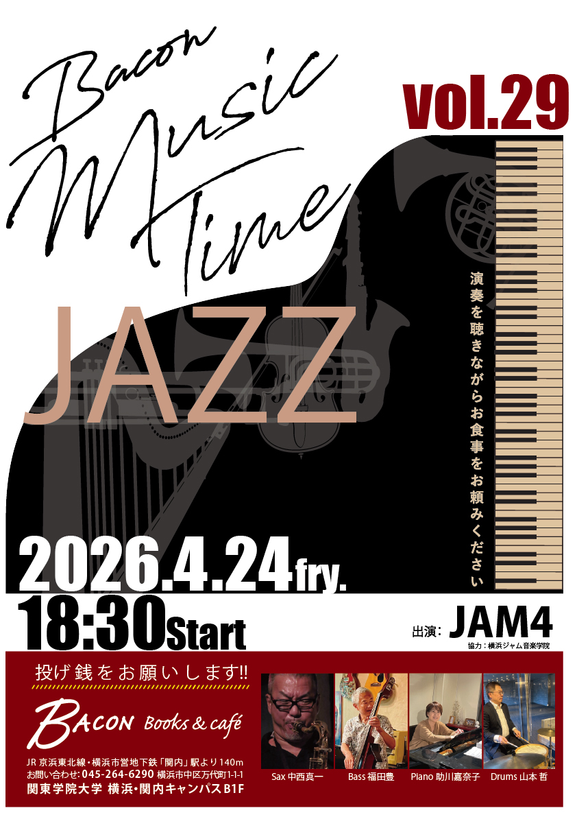 Bacon Books & cafe ライブ4月24日(金)18時30分~ 更新日: 2026/03/25 category: TOP > イベント・ライブ情報 > Bacon Books & cafe ライブ 4月24日(金)18時30分~ イベント・ライブ情報 一覧へ お気軽にお問合せ下さい 無料体験レッスン・見学・ご質問等 045-242-6324 受付時間 10:00~21:00 定休日 なし 無料体験・お問合せ 練習可能な時間 10:00~20:50 レッスン可能な時間 10:00~21:50 住所:横浜市中区花咲町2-62-8 ジャムビル
